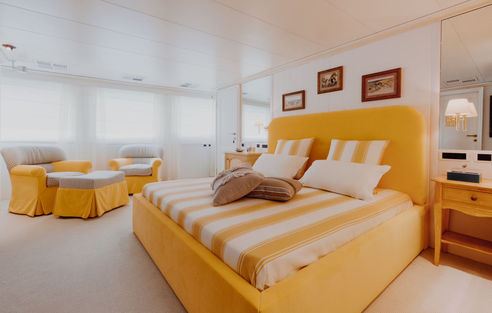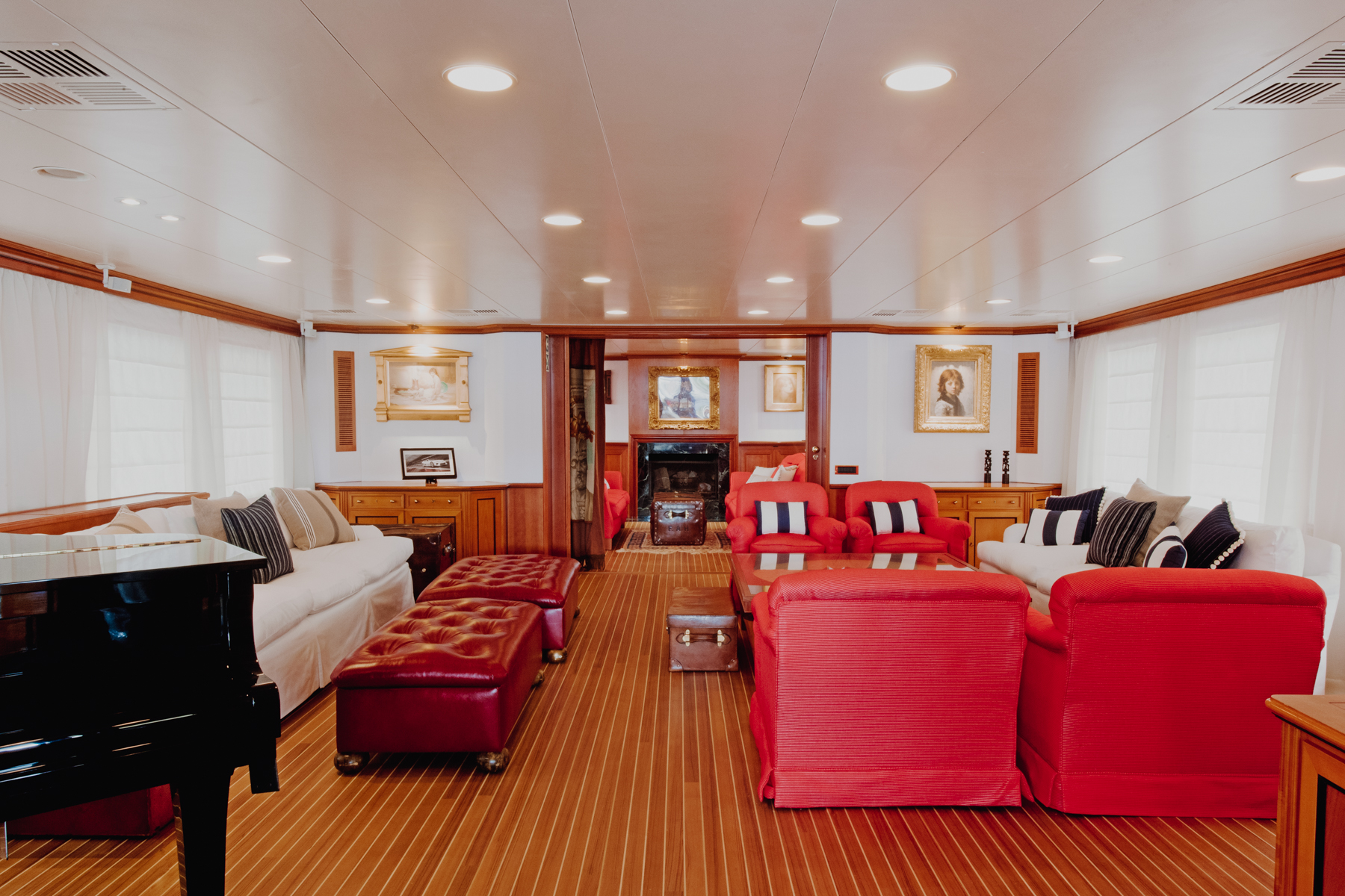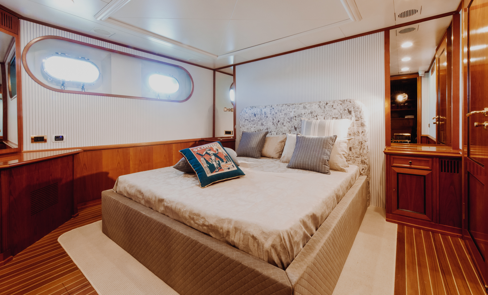 La pavimentazione interna di tutta la barca è stata sostituita da teak massello con fughe bianche, per il LD è stato poi inserito un inserto di moquette come scendiletto. Sul MD sono stati tappezzati tutti gli arredi con stoffe dal sapore vintage, arricchendo gli spazi con bauli d’epoca in cuoio, oggetti in ottone ed opere d’arte.